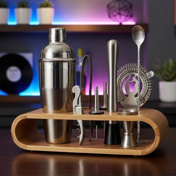 Vosco VSC-10F Ahşap Standlı Kokteyl Hazırlama Seti, 10 Parça, Paslanmaz Çelik