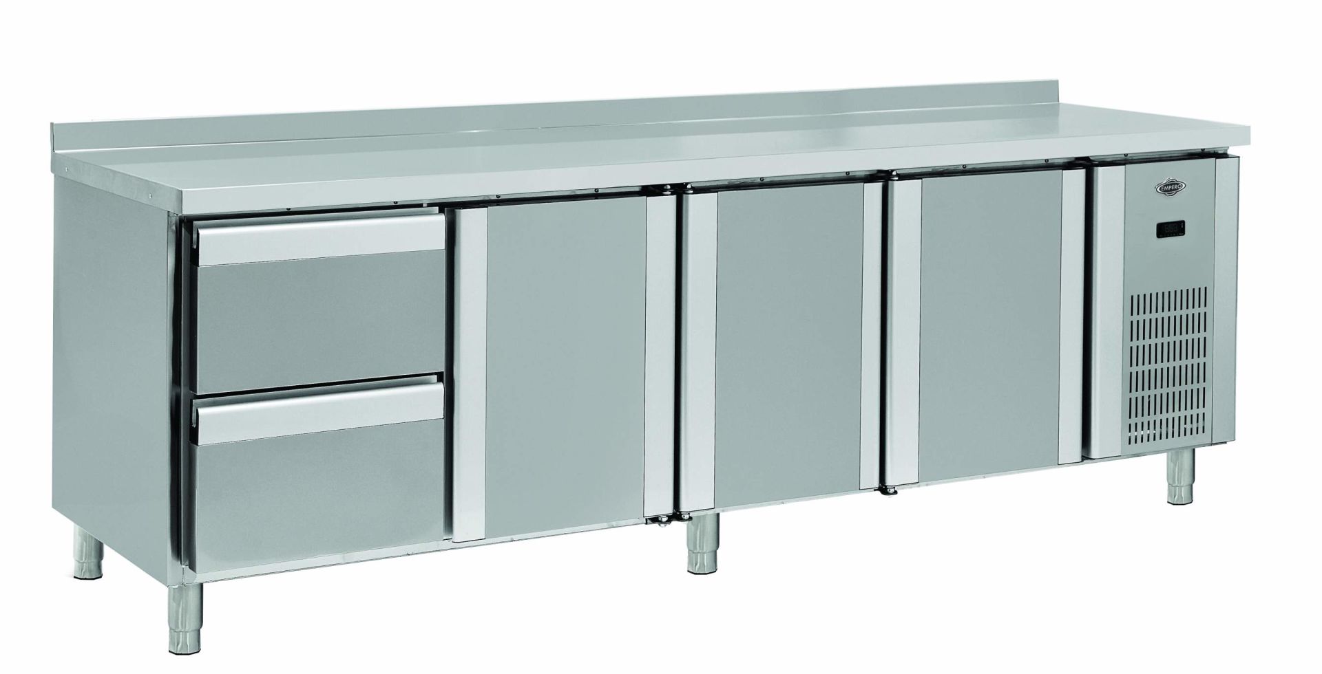 – 1/1 150 Gn kapasiteli çekmeceler.- Çalışma aralığı 0/+5 ºC (tropikal 43 ºC)- 220-230V -1 +N 50-60 Hz elektrik gücü.- “CFC Free” R-134 A soğutucu gaz.- 40 kg/m³ yoğunluk.- Sıcaklık ve defrost kontrollü dijital gösterge.- Defrost esnasında otomatik su buharlaştırma.- Fanlı soğutma.- 48 mm kalınlığında “ozon dostu” poliüretan izolasyon.- 45 derecede sabit kendiliğinden kapanan kapılar.- Alüminyum panelli,bakır borulu evaparatör.- Ayarlanabilir, paslanmaz çelik raf yuvaları, plastik raflar..- Paslanmaz çelik gövde. Kod Ürün Adı Ebatlarmm Ağırlıkkg Netm3 Güçkw Kapasitelt a b c EMP.150.70.01-2C Tezgah Tipi Buzdolabı 2 Çekmece+1 Kapı (Fanlı) 1500x700x850 137 0.9 0.14 300 EMP.150.70.01-4C Tezgah Tipi Buzdolabı 4 Çekmece 1500x700x850 160 0.9 0.17 300 EMP.200.70.01-2C Tezgah Tipi Buzdolabı 2 Çekmece+2 Kapı (Fanlı) 2000x700x850 163 1.2 0.16 500 EMP.200.70.01-4C Tezgah Tipi Buzdolabı 4 Çekmece+1 Kapı (Fanlı) 2000x700x850 182 1.2 0.16 500 EMP.200.70.01-6C Tezgah Tipi Buzdolabı 6 Çekmece 2000x700x850 207 1.2 0.31 550 EMP.255.70.01-2C Tezgah Tipi Buzdolabı 2 Çekmece + 3 Kapı (Fanlı) 2550x700x850 207 1.5 0.21 700 EMP.255.70.01-4C Tezgah Tipi Buzdolabı 4 Çekmece + 2 Kapı (Fanlı) 2550x700x850 226 1.5 0.21 700 EMP.255.70.01-6C Tezgah Tipi Buzdolabı 6 Çekmece + 1 Kapı (Fanlı) 2550x700x850 248 1.5 0.37 700 EMP.255.70.01-8C Tezgah Tipi Buzdolabı 8 Çekmece 2550x700x850 275 1.5 0.60 700